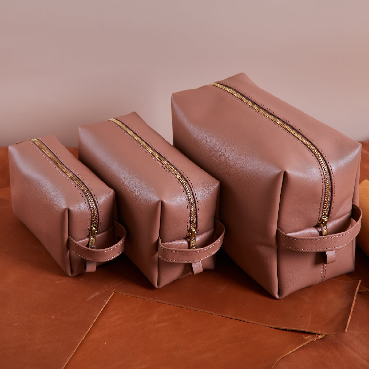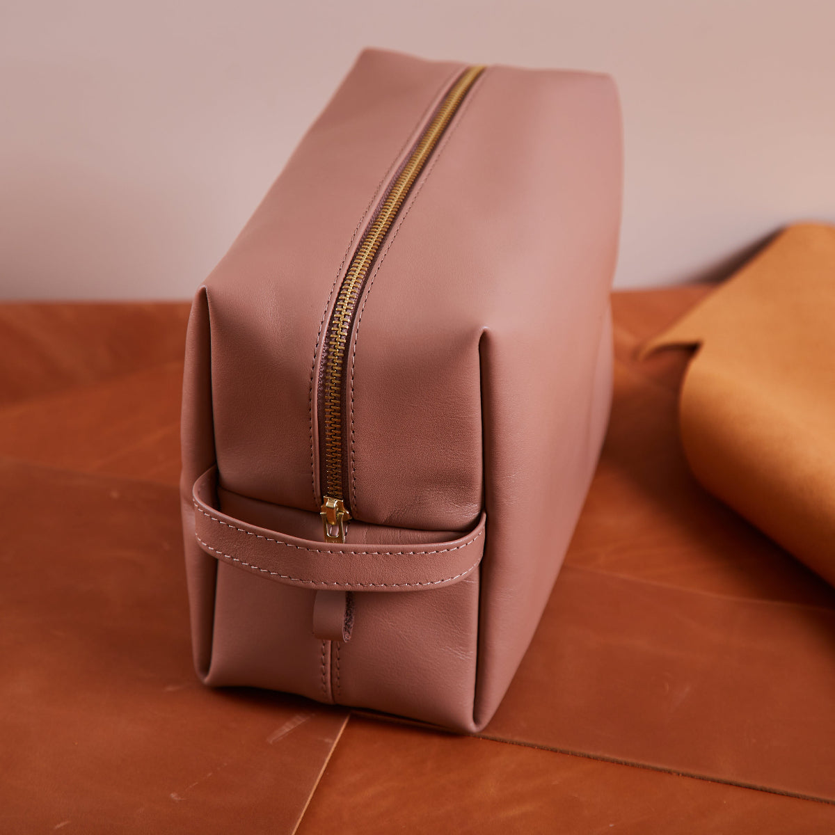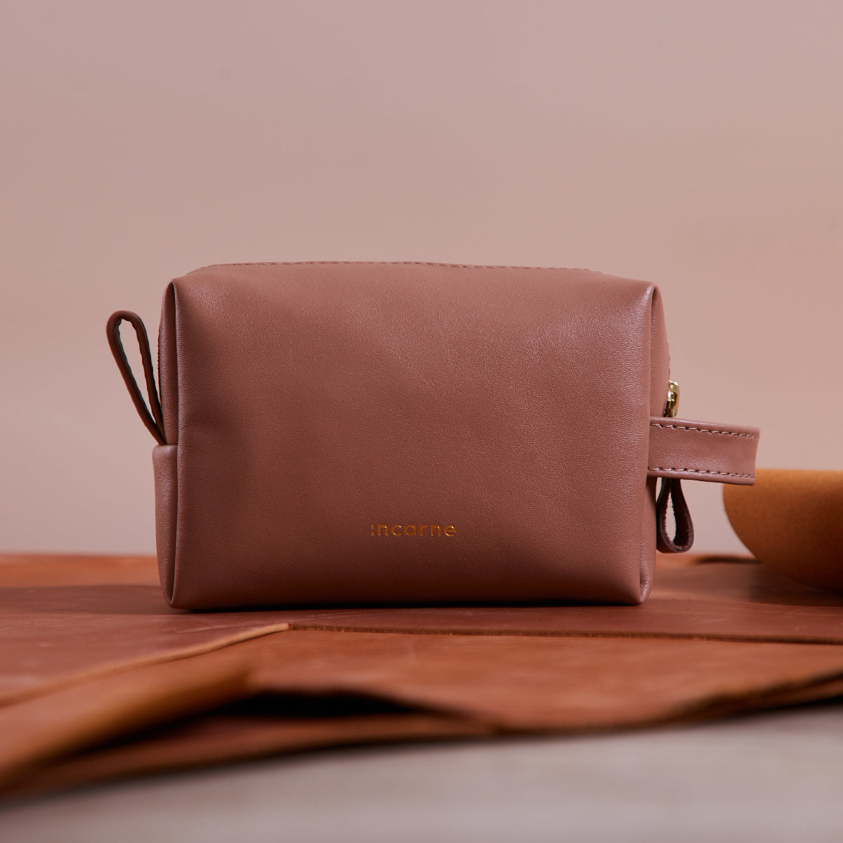 The Mirage leather cosmetic bag is crafted from genuine leather in an elegant mocha shade. It features a durable brass-colored YKK zipper and a sturdy handle. The front is accented with a gold-embossed INCARNE™ logo.