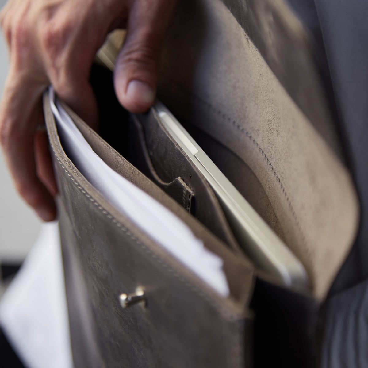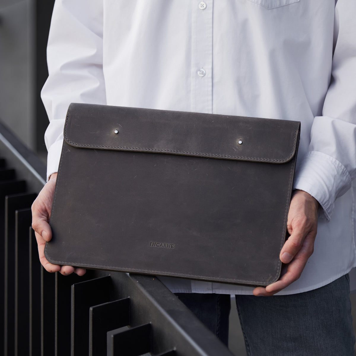 The Neat leather MacBook laptop sleeve in gray combines minimalist design with exceptional functionality. Made from genuine vintage leather, it offers durability and a timeless look. The flap closure secures inner compartments for a laptop and documents, plus a pocket for small items and a slot for cards or business cards.
