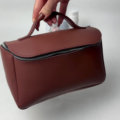 Neceser de cuero para hombres y mujeres en un elegante tono marrón Timeless. El diseño es práctico y minimalista. El neceser se cierra con una cremallera y cuenta con un cómodo asa superior. Sin forro en el interior, complementado con un bolsillo interno adicional para pequeños esenciales.