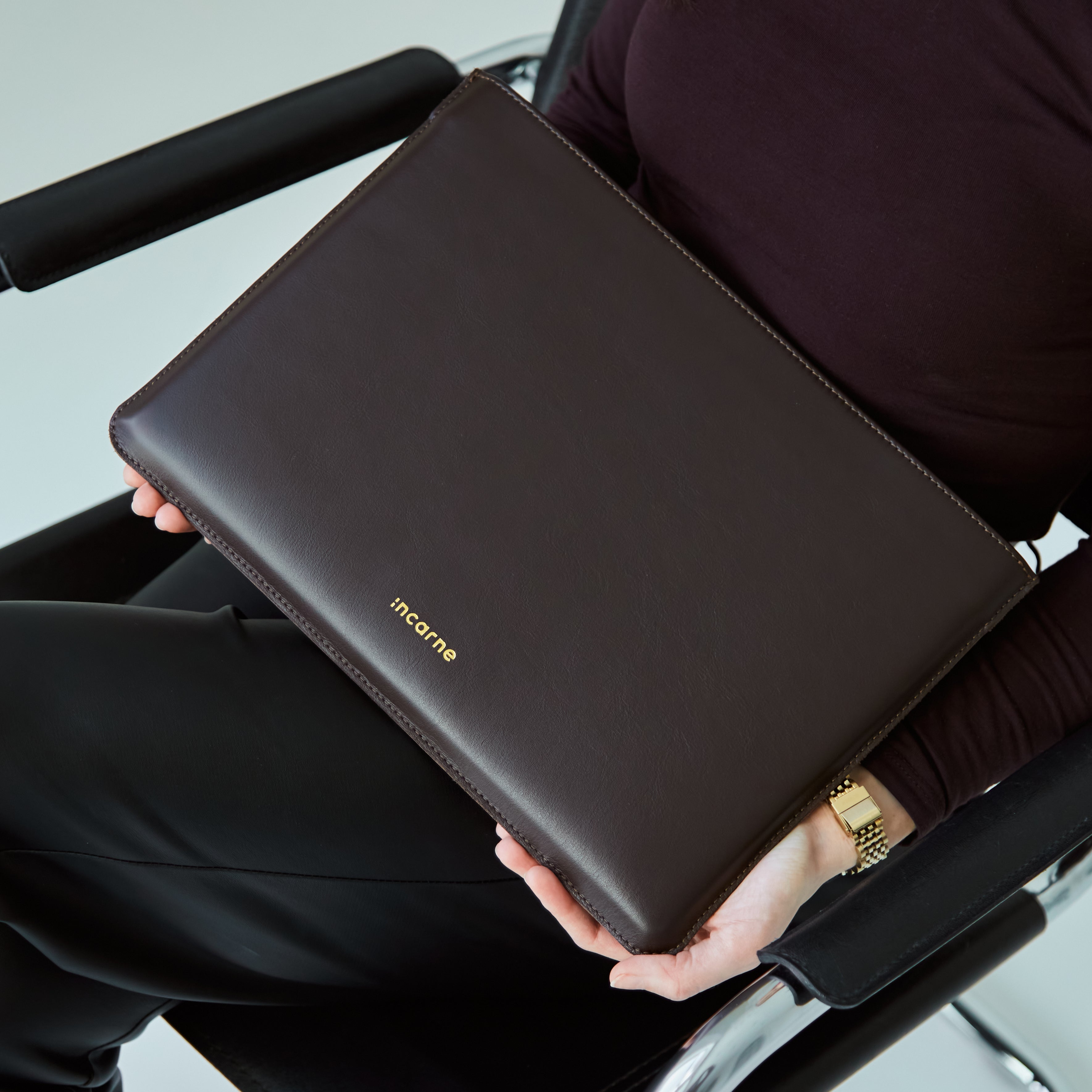 A standout piece from INCARNE’s latest collection, this minimalist laptop sleeve impresses with its elegant chocolate tone and timeless aesthetic.