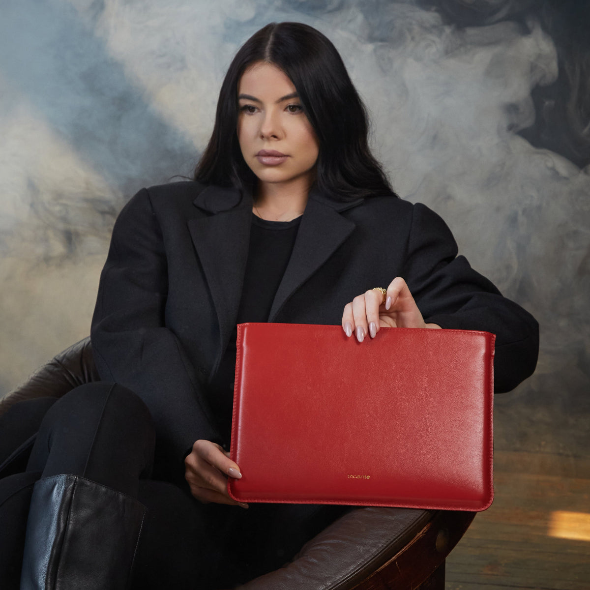 Red leather MacBook sleeve Cline — bold, stylish, protective. Made from premium genuine leather with a smooth texture, it features a soft sand-colored velvet lining and a protective inner layer.