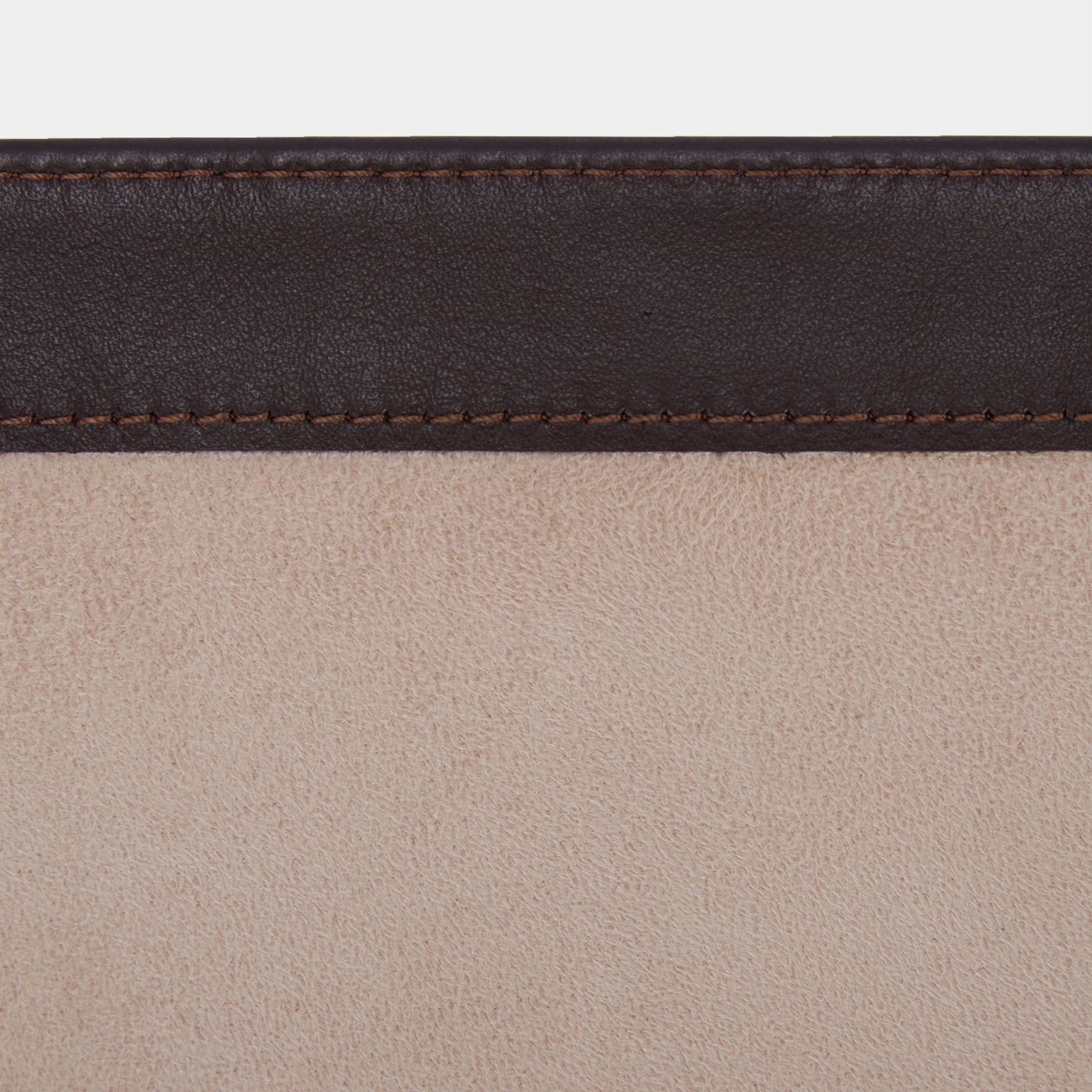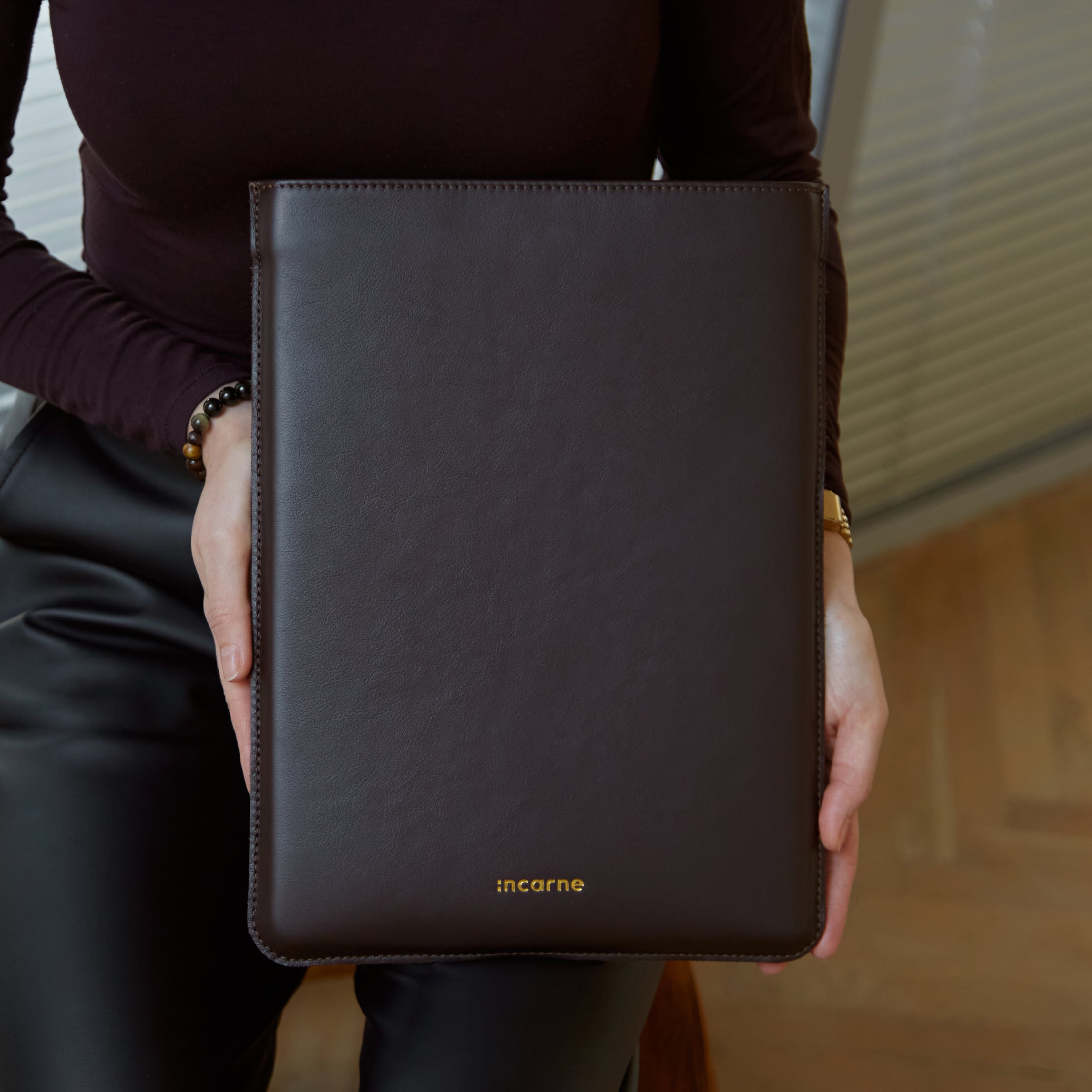 The laptop sleeve for MacBook ClineUp is crafted from premium chocolate-colored leather. Inside, it features a soft velvet lining and a special thin cushioning layer that provides added protection for your device. Thanks to its vertical design, it allows easy access for charging without removing the laptop.
