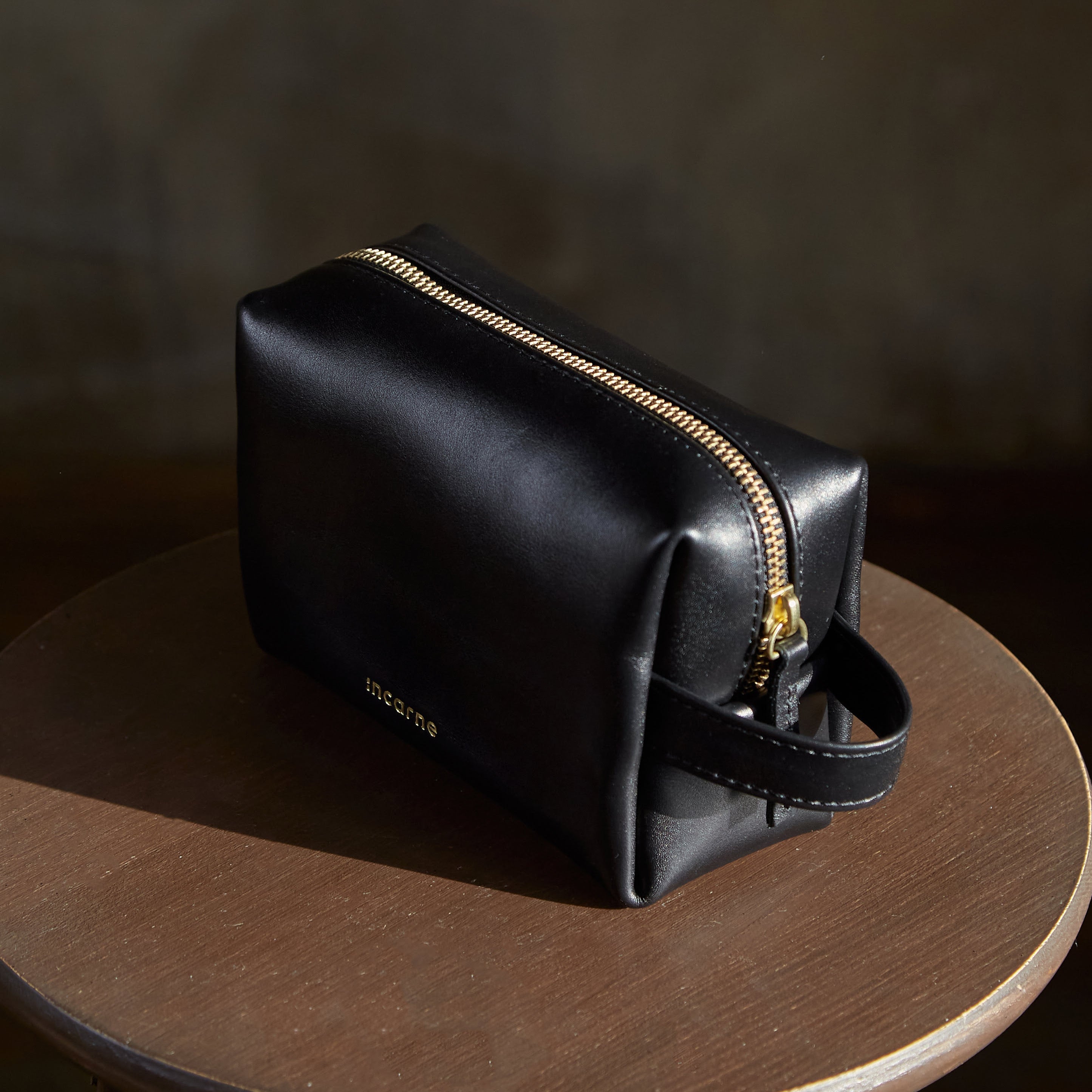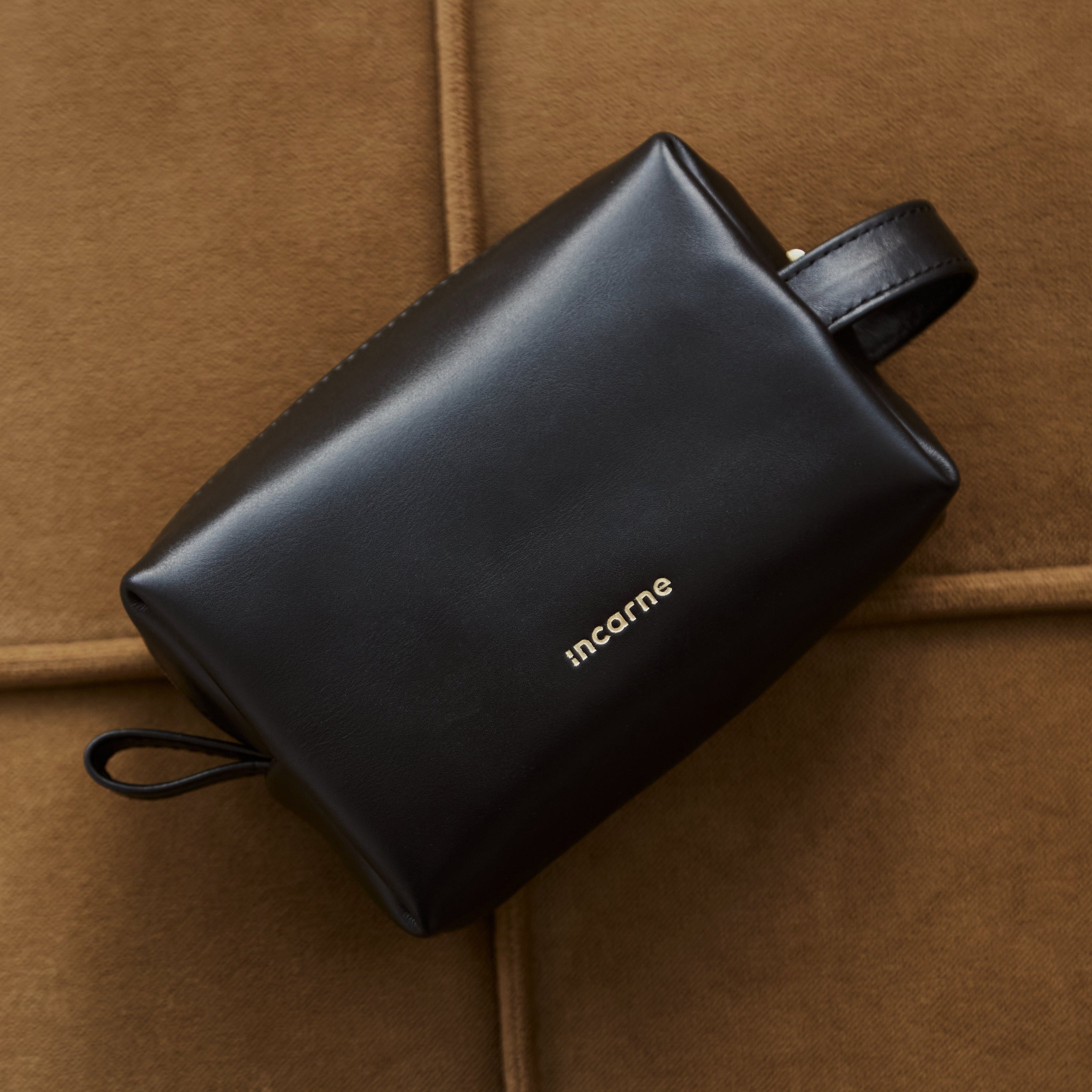 The Mirage Small leather cosmetic bag is compact yet spacious, crafted from genuine leather in a timeless black shade. It features a brass-toned YKK zipper, a sturdy handle, and elegant gold-embossed INCARNE™ branding on the front.