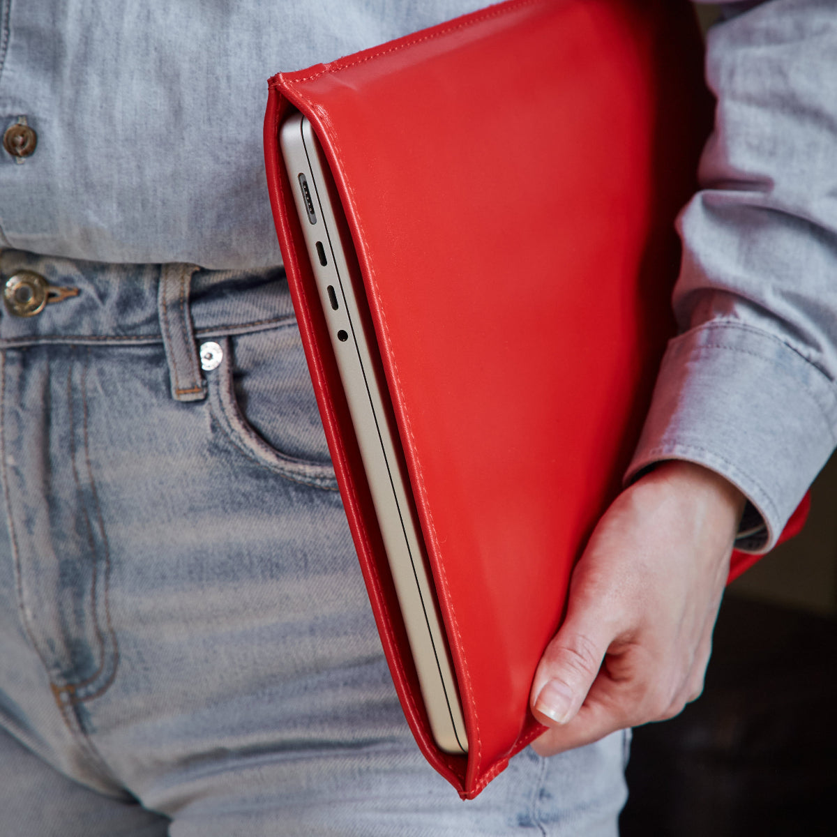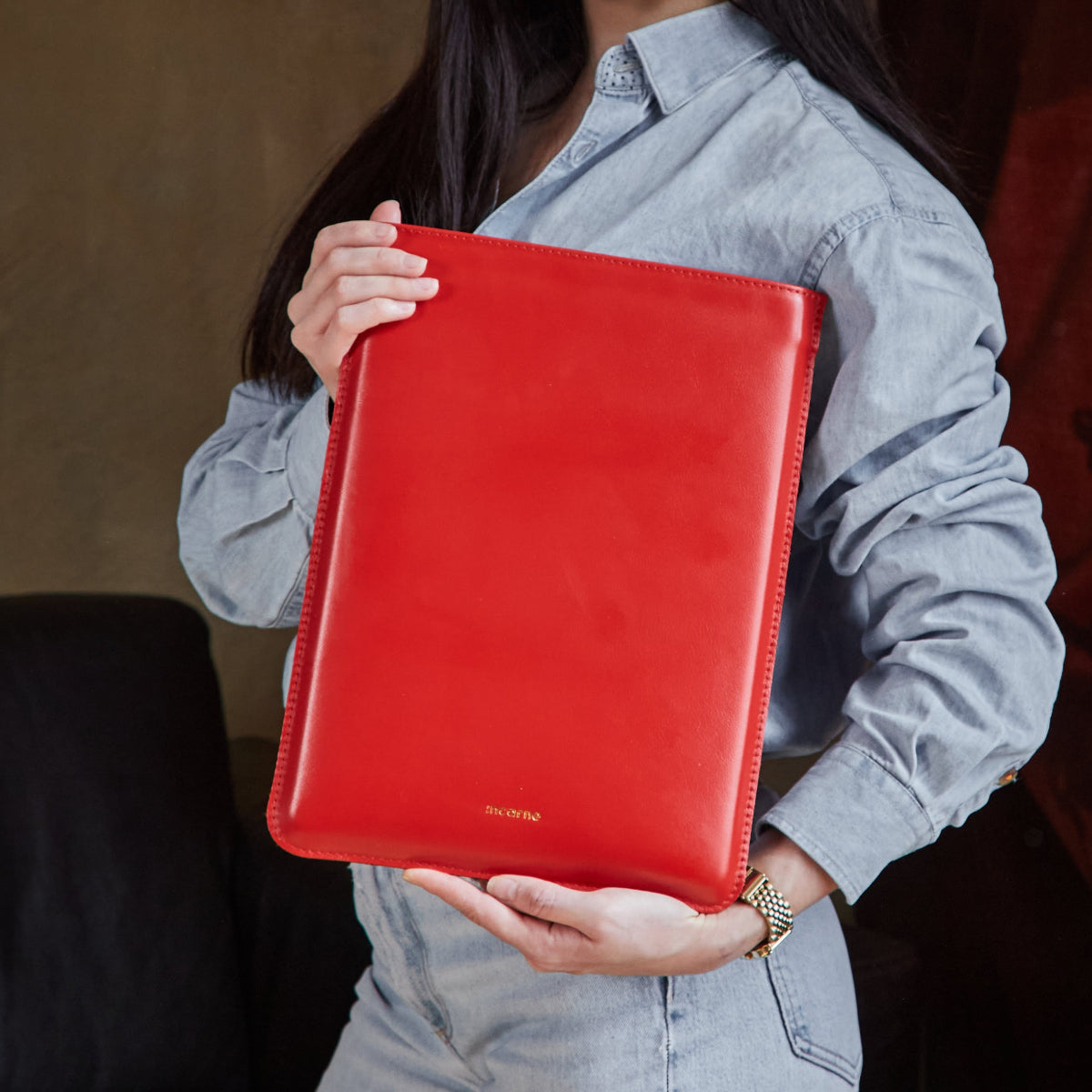 The MacBook Sleeve ClineUp in rich red genuine leather blends minimalist design with practicality and timeless elegance. It features a soft velvet lining and an additional cushioning layer to ensure reliable protection for your laptop.
