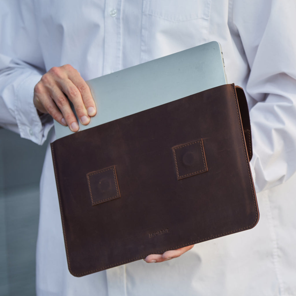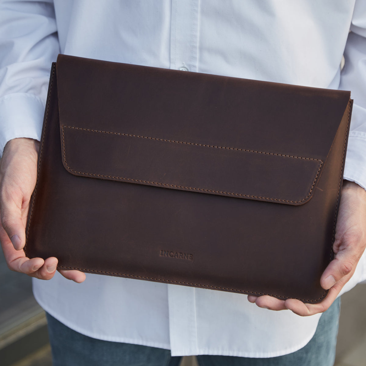 The Line laptop sleeve by INCARNE™ is crafted from premium vintage leather in an elegant brown tone. Smooth lines create a minimalist design free of excess detail, while the magnetic flap adds both character and convenience.