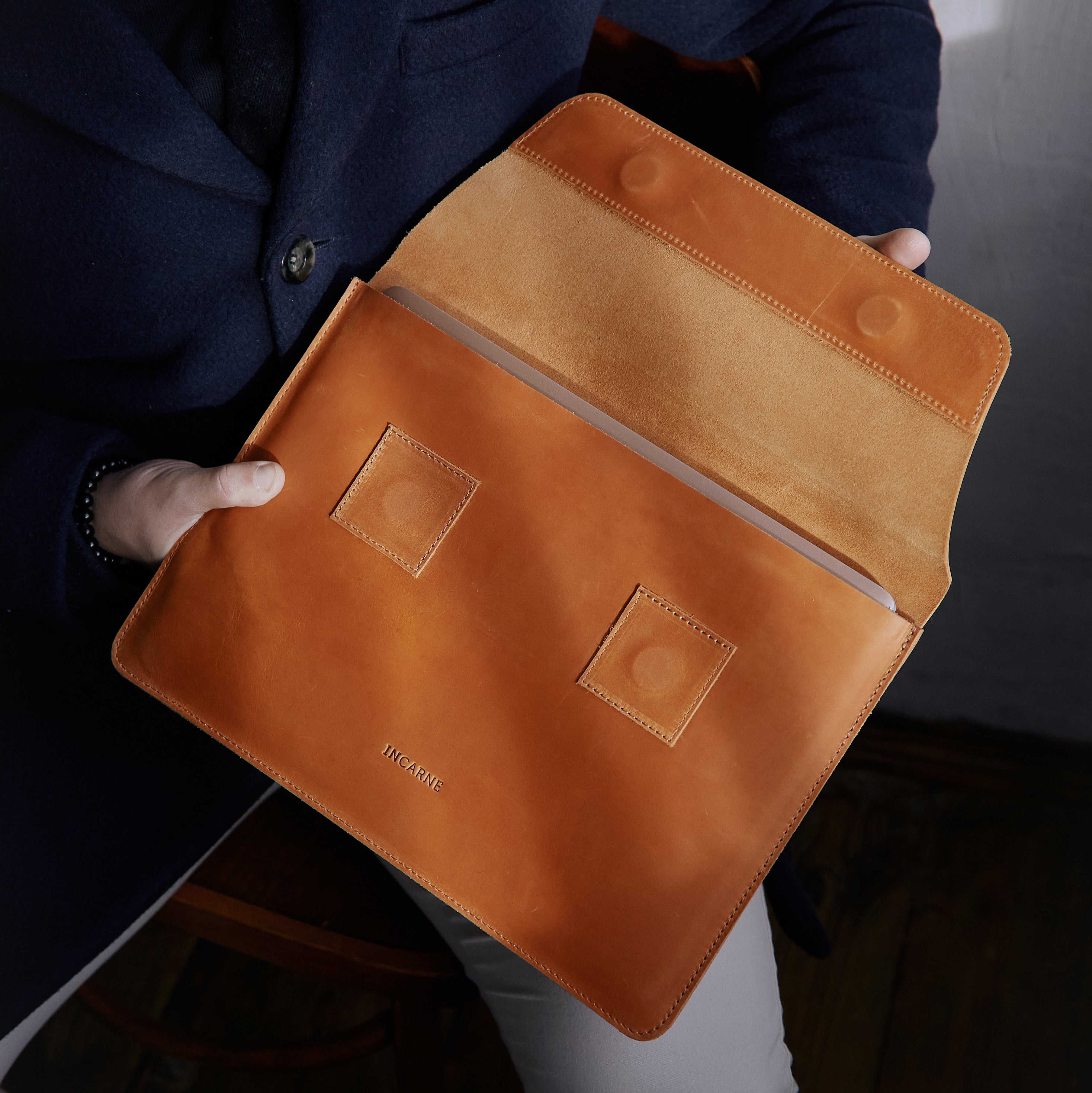 This premium leather case fits MacBooks and other laptops perfectly — a refined accessory always within reach.