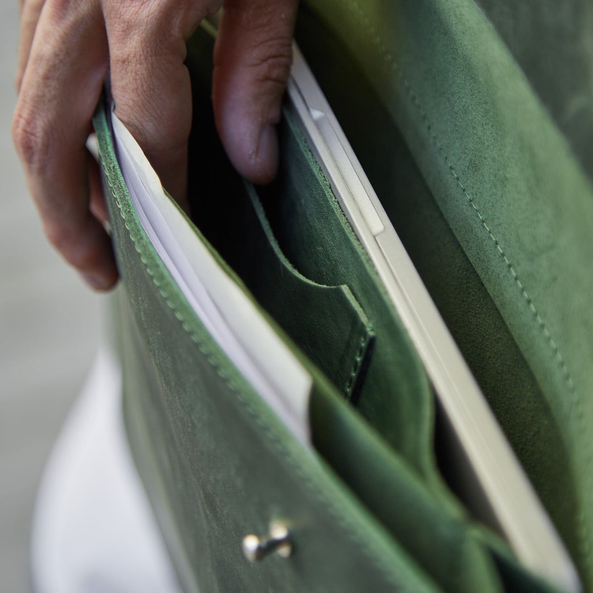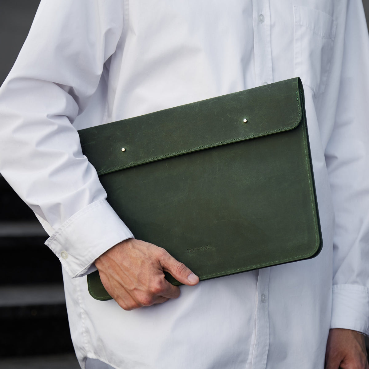 The Neat leather laptop sleeve in black offers reliable protection with stylish appeal. Made from genuine vintage leather, it features a magnetic flap closure, three compartments, and a card pocket. Perfect for storing a laptop, documents, tablet, and more.